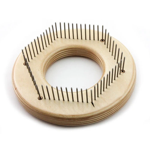 The TURTLE hexagon pin loom is made of quality Baltic Birch plywood, finished beautifully with two coats of traditional clear Shellac, sealed with satin Poly. The hexagon weaving area measures about 4” side-to-side, and each of the six hexagon sides measures a little over 2”.